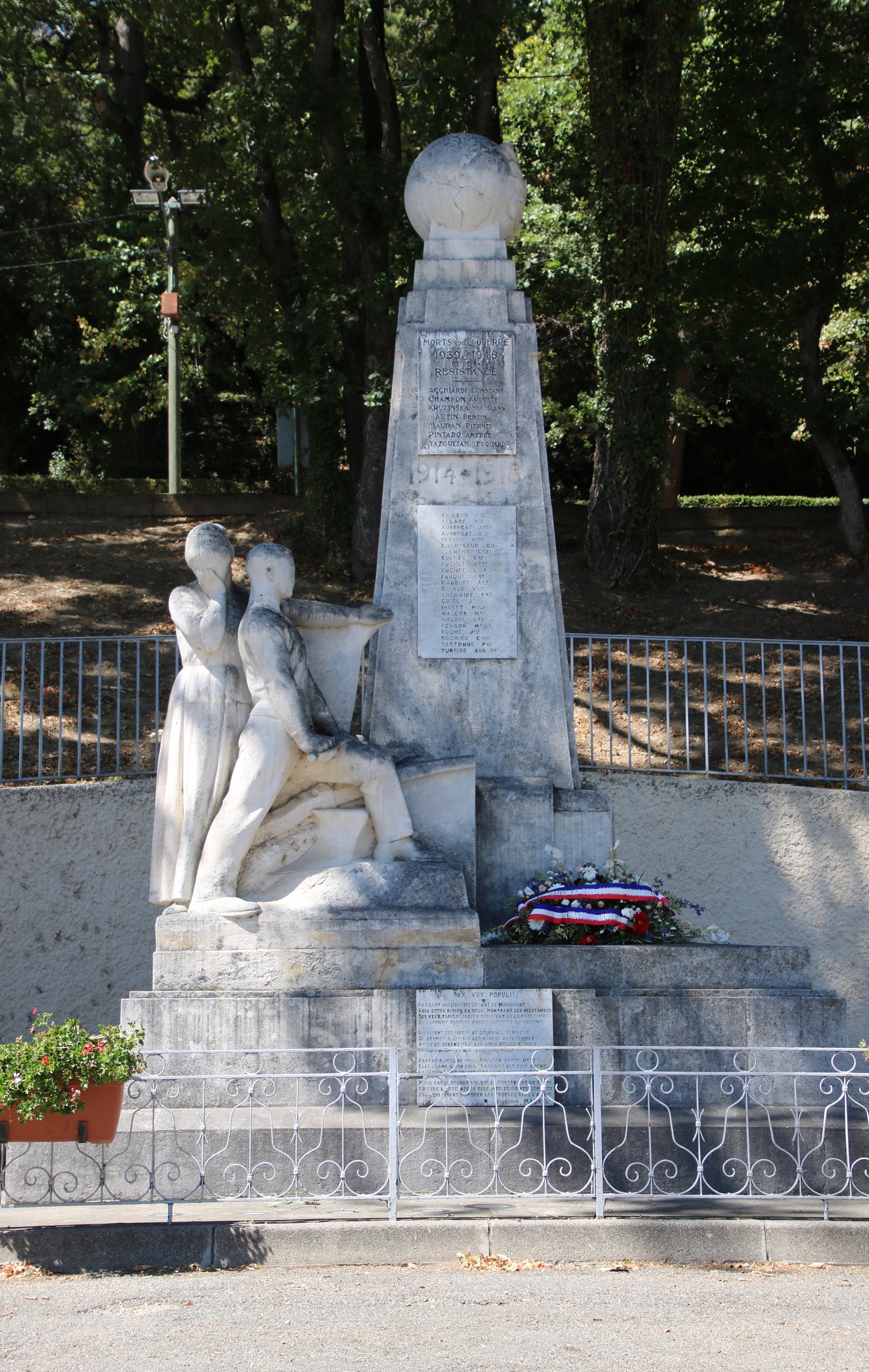 Le Monument aux Morts, pacifiste place de la Résistance fut édifié en 1930 à l’initiative du maire Victorin Maurel, créateur de la Ligue départementale des Droits de l’Homme. Il est classé monument historique depuis 2010. En haut du monument, il y a une branche d’olivier entourant un globe terrestre »